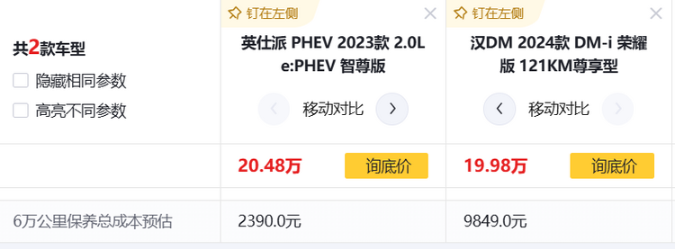 從價格來看,售價22.98萬元的英仕派PHEV智尊版,比漢DM-i榮耀版121KM尊享型高了3000元,但從經銷商的終端優惠來看,英仕派PHEV的實際到手價格只會更低。