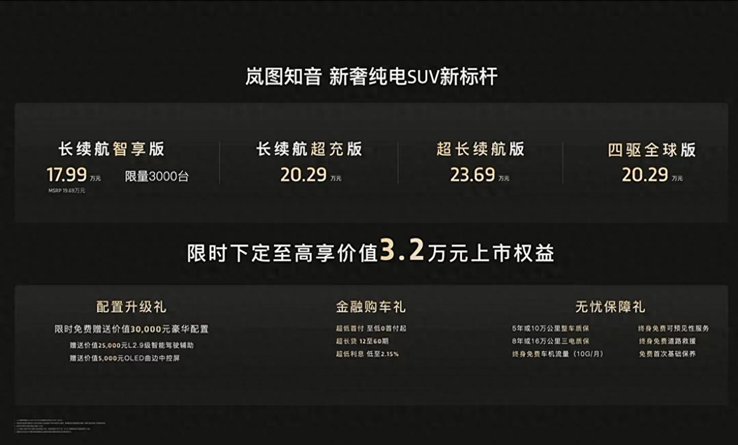 10月13日,嵐圖知音正式上市了。新車售價區間為19.69-23.69萬元,共推出四款車型,其中入門版的長續航智享版還有限量優惠價,為17.99萬元(限量3000臺),這比指導價直接便宜了1.7萬元。據悉,新車定位中型SUV,這是嵐圖品牌旗下的第四款車型,同時也是嵐圖新一代自研純電平臺下的首款車型,并且新車會面向全球銷售。