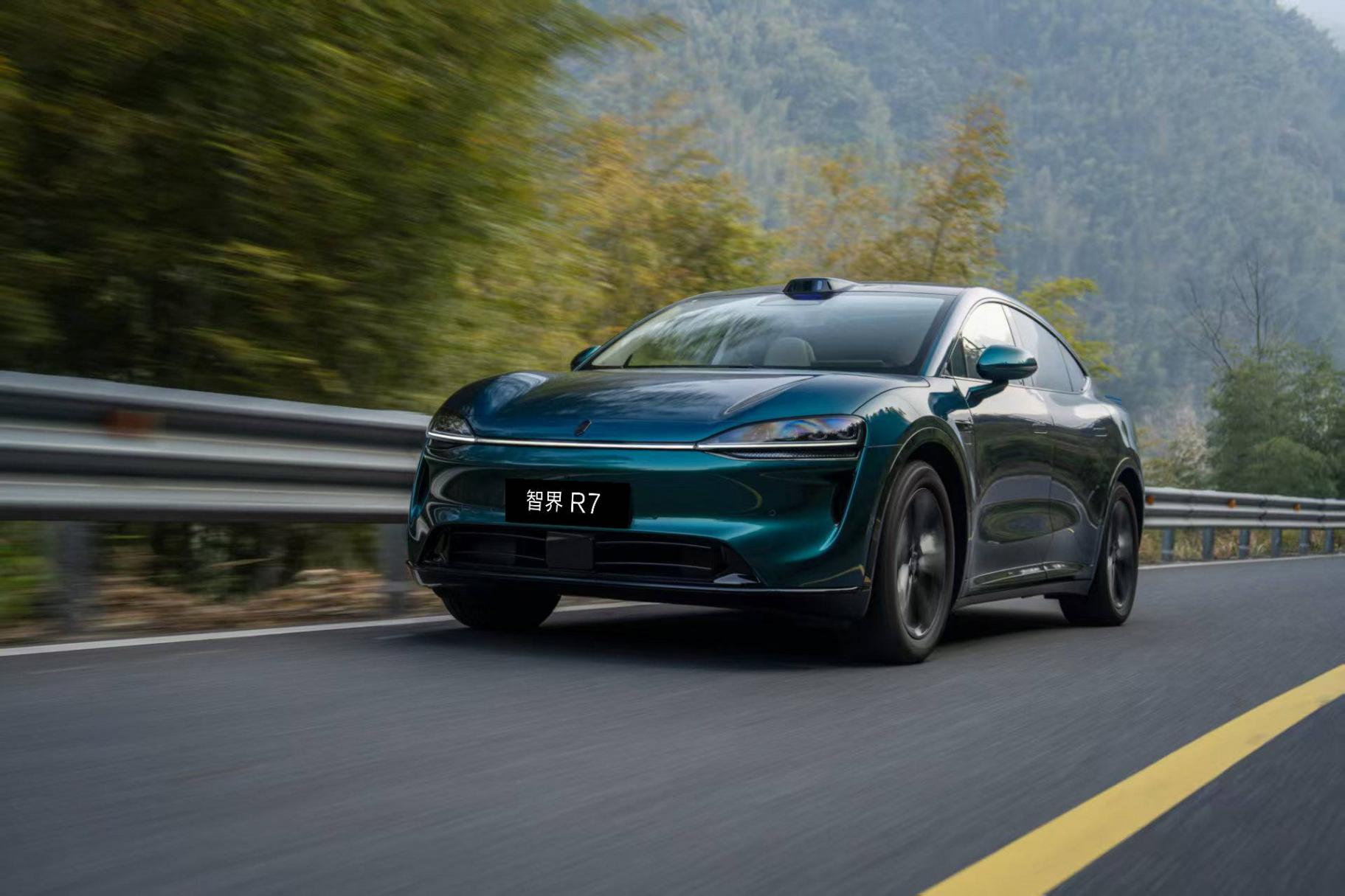 本次試駕車輛是智界R7純電版本,外觀上看,是新增的極光綠的車色,三種珠光漆帶來層次豐富且高質感的視覺體驗,光線變化時會有隨角異色效果,整車在明暗面顏色呈現豐富變化。